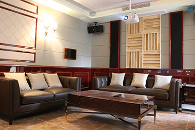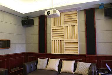 這是一間30平方米左右的獨立影院空間,這個房間雖然看不到音響設(shè)備,但實際是融合了5.1.4的全景聲影院。房間雖然不是很大,項目初期,在聲學設(shè)計上花了不少心思,為了克制平行墻面的震蕩回聲現(xiàn)象,中間空余位置填充了吸音材料,盡量把影視廳混響控制在0.4-0.5區(qū)間。