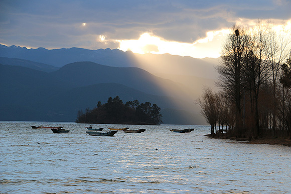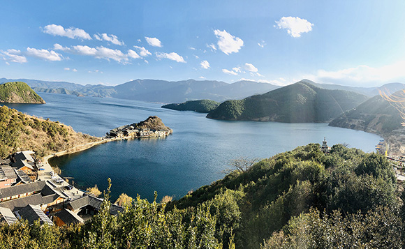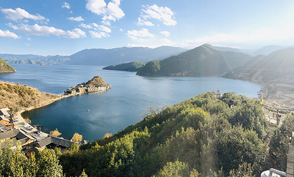 里格島是湖畔一個美麗的半島,三面環(huán)水,左右青山環(huán)抱,背靠格姆女神山,風景如畫。